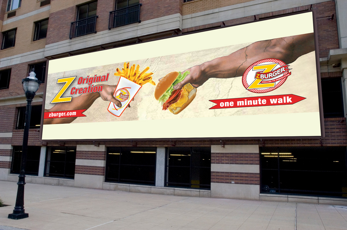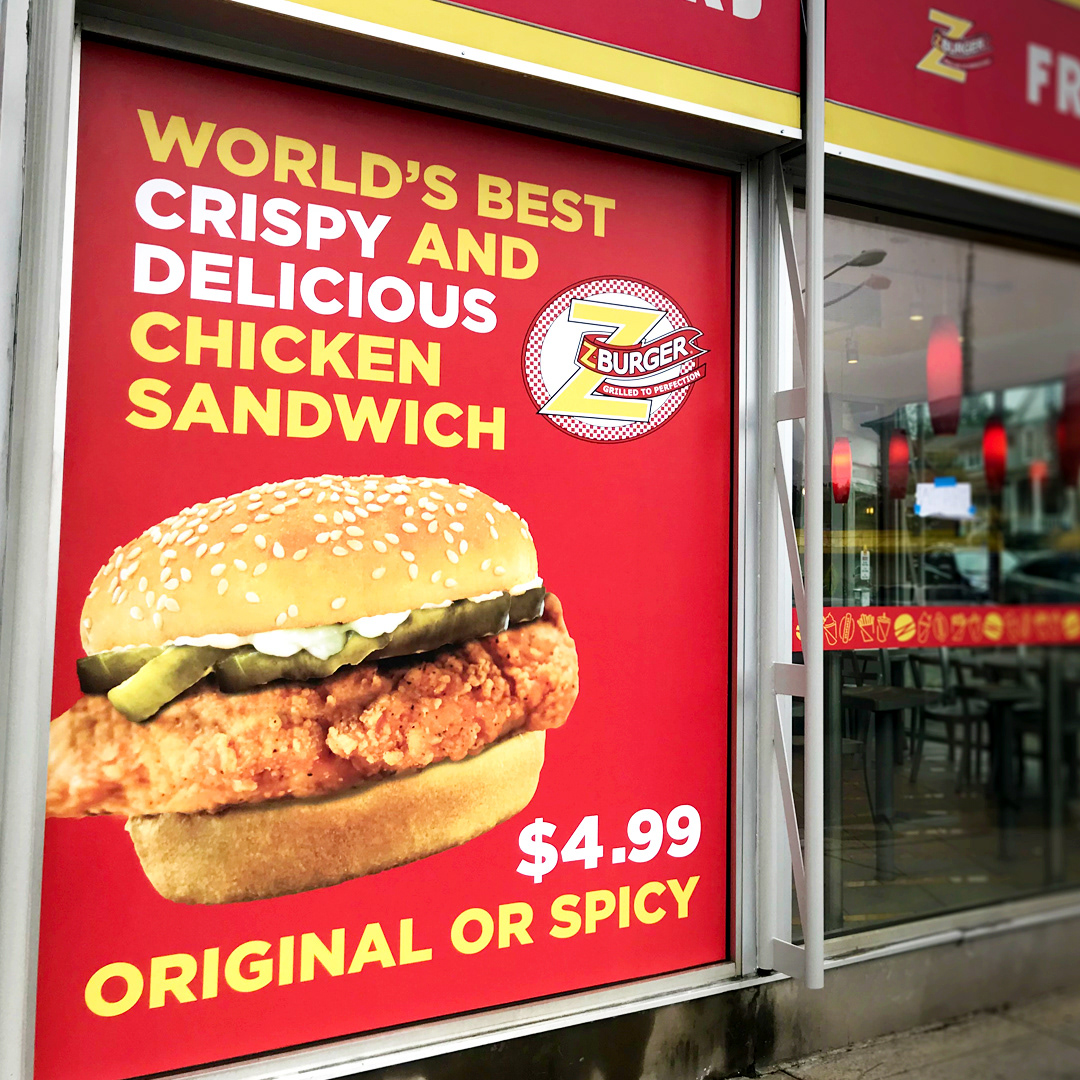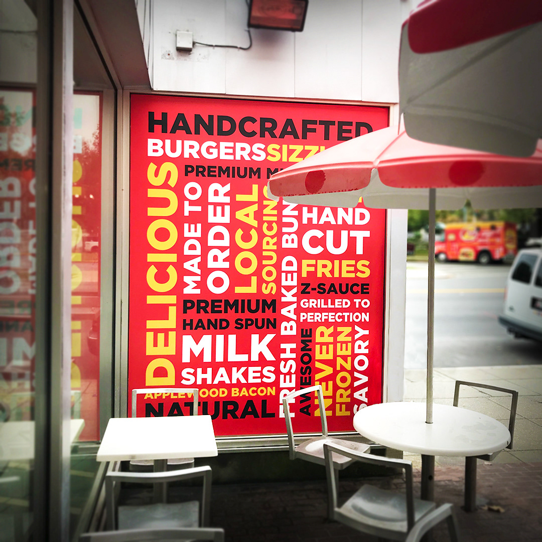 Large format graphics for a well established fast-food chain restaurant in Washington DC. The goal was to capture the attention of college students that walk or drive by daily.